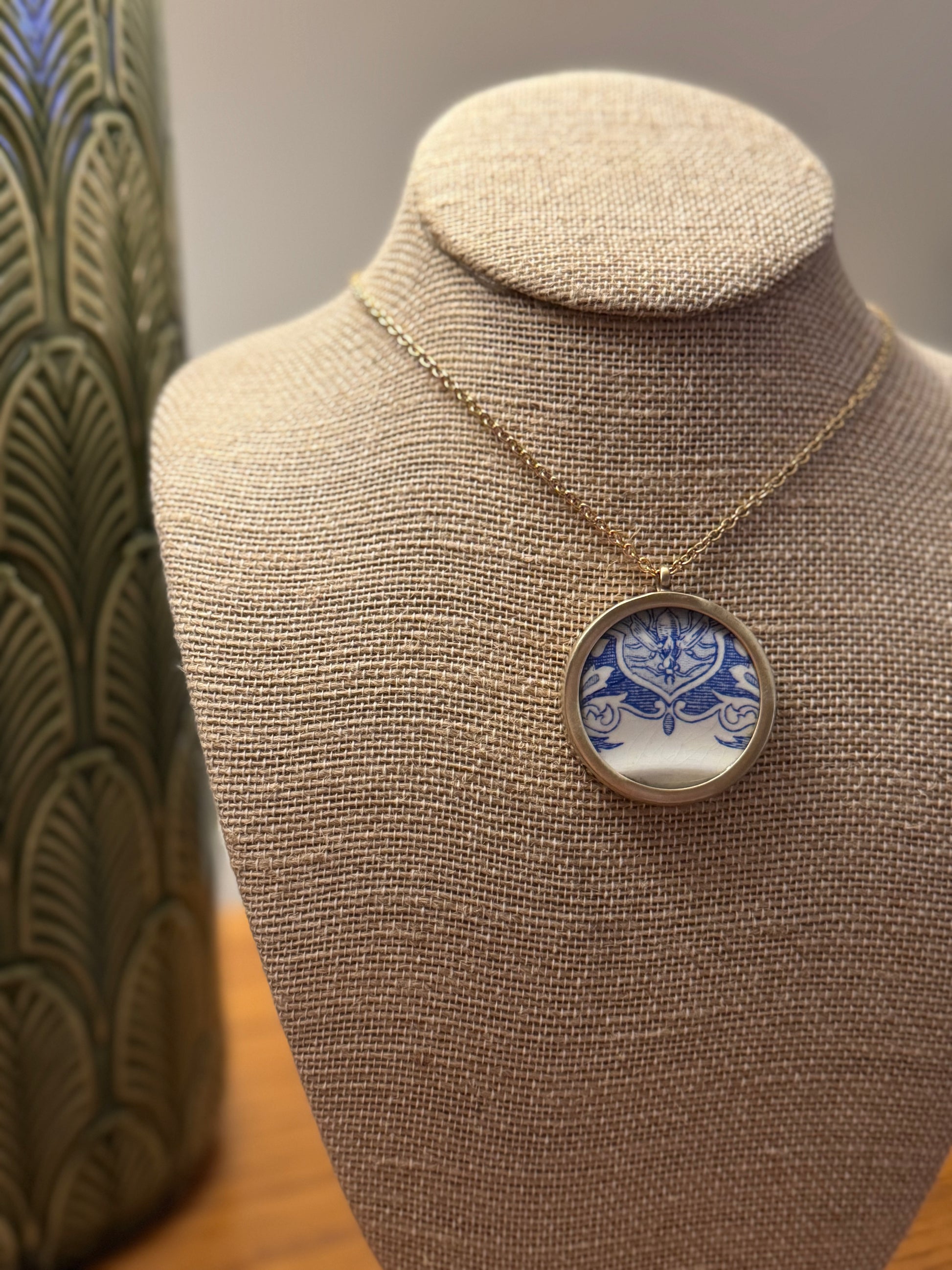 Handmade pendant in brass with a salvaged European porcelain plate. Nickel free, hypo allergenic 24" stainless steel chain included.