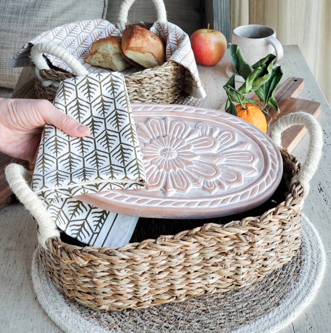 Keep your bread and tortillas warm and fresh throughout the meal. This terracotta warming stone is naturally insulating, and woven basket has been handwoven from sustainably grown seagrass.