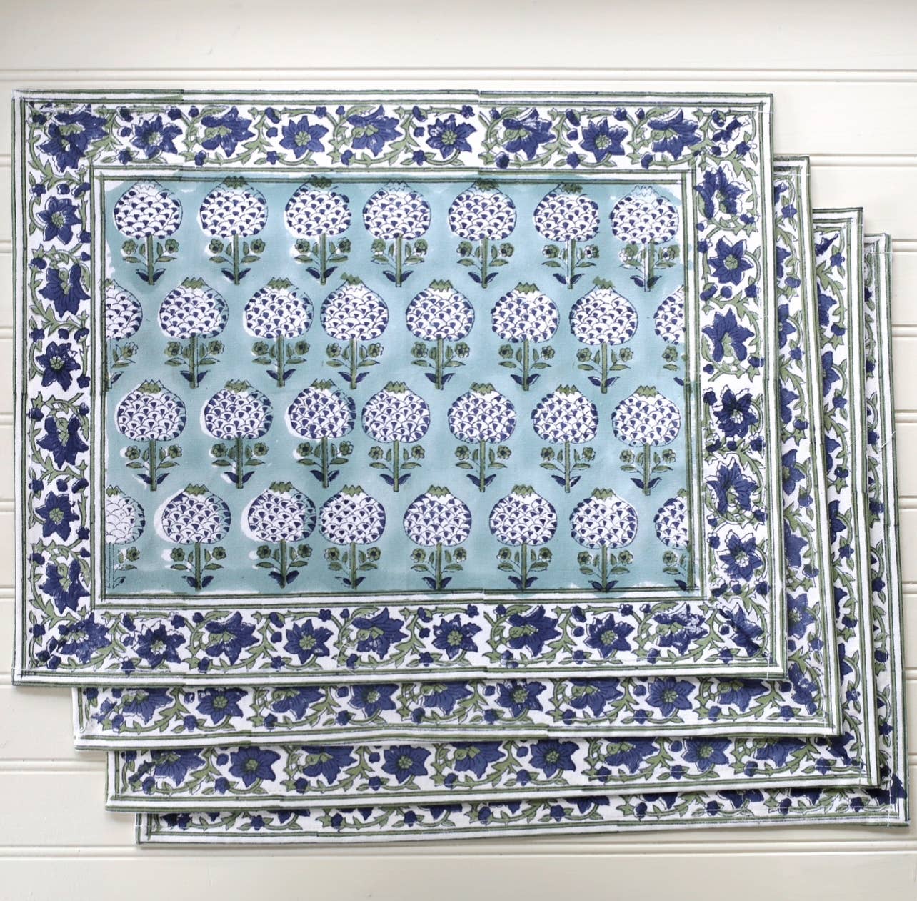 Granada—Spanish for pomegranate—has long symbolized abundance and prosperity across cultures. Inspired by the flourishing pomegranate trees of Granada, Spain, our stylized motif is hand block printed onto placemats in smokey blue-teal hues. This set of four cotton placemats brings heritage, beauty, and meaning to the modern table.